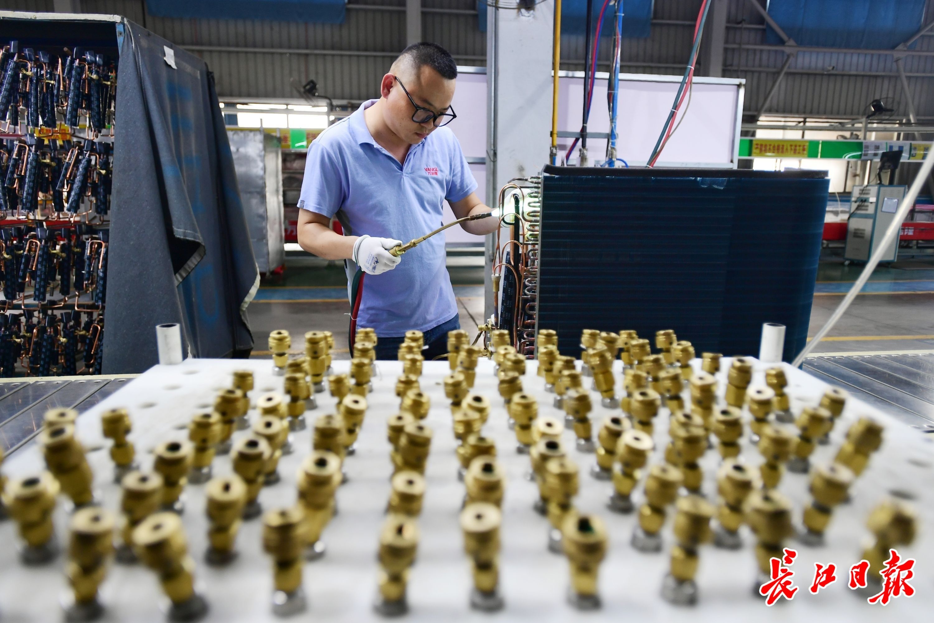 车间里物料车来回穿梭,9条生产线24小时连轴转。满载空调的车,一辆接一辆从位于蔡甸区的中德国际产业园开往全国各地。