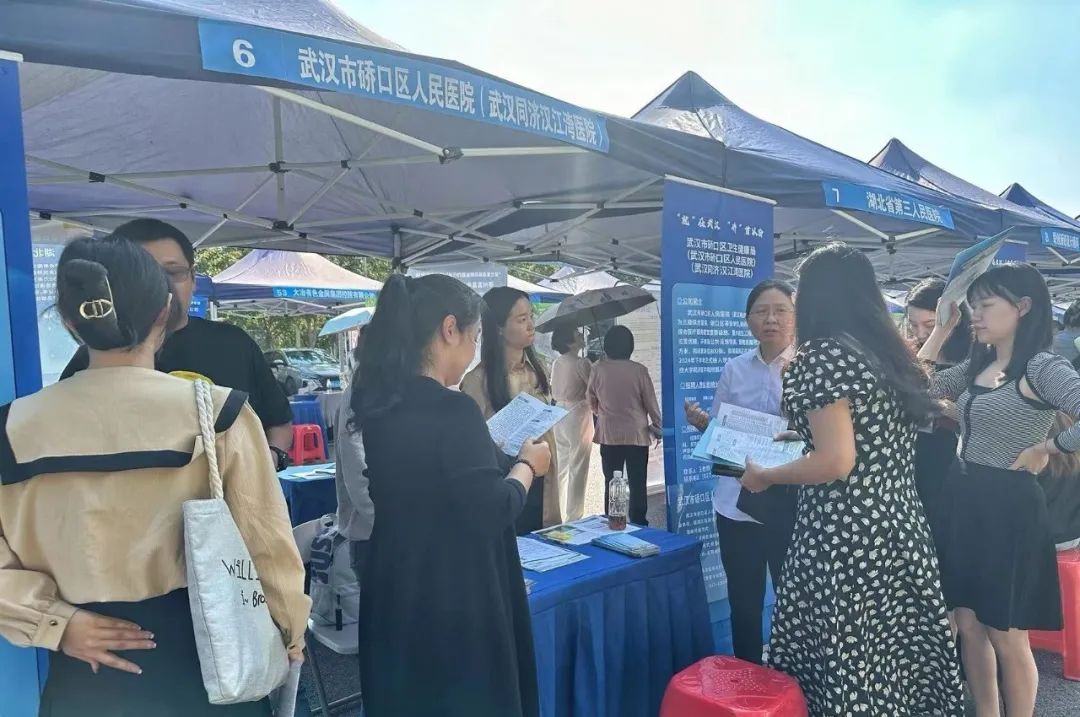 在硚口区人民医院(武汉同济汉江湾医院)的展位前,一个特别的“求职团”格外引人注意,江汉大学医学部党委副书记曾老师正带着几位辅导员,拿着十余名学生的简历向医院推荐、咨询岗位信息。