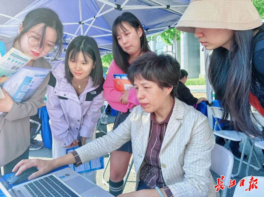 ▲江汉大学医学部老师现场帮未能到场的学生咨询岗位