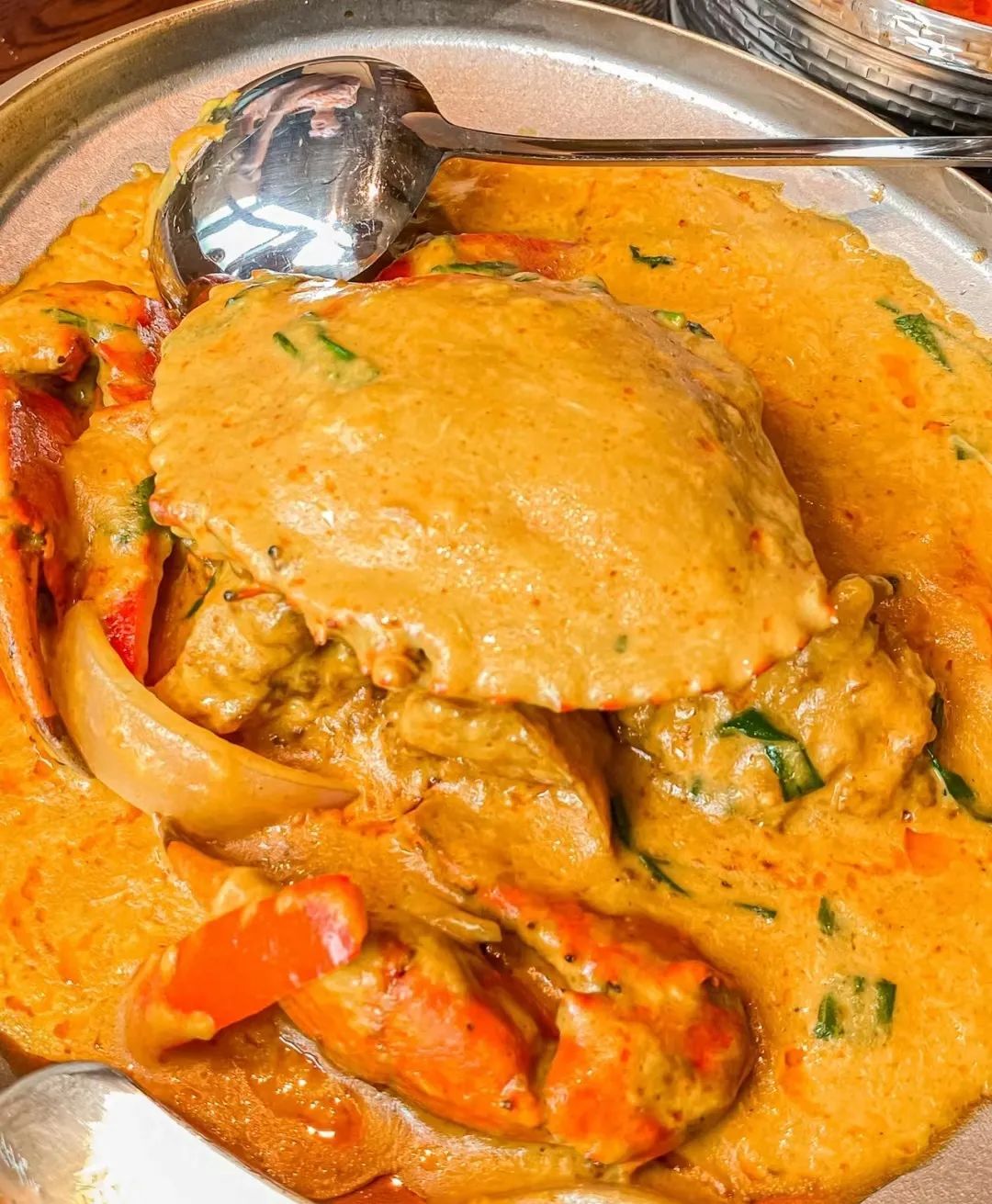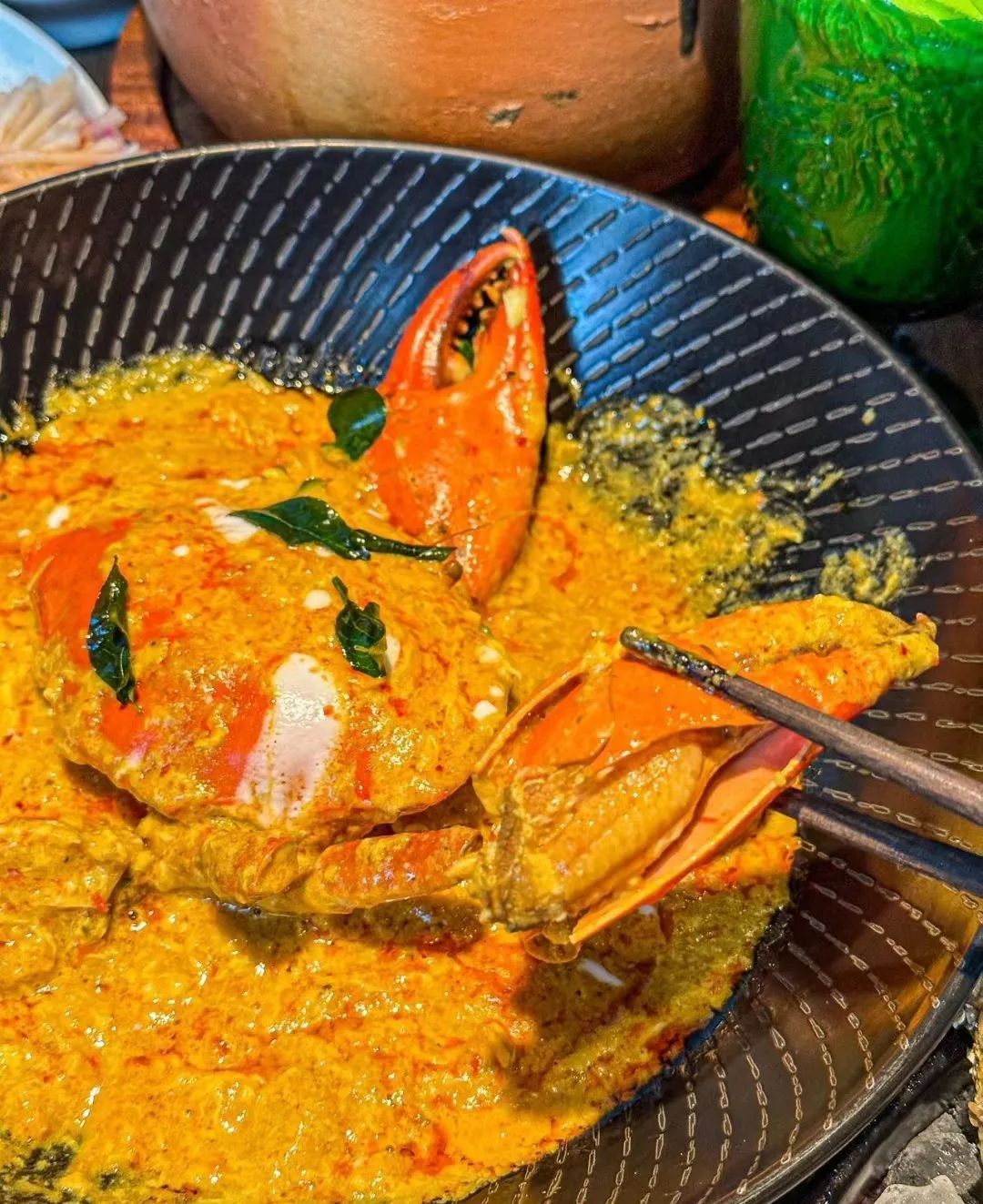 大火猛炒让蟹肉均匀的沾上咖喱粉后移入砂锅中,全程不加一滴水,用蟹肉本身的水份焖焗而成,原汁原味。