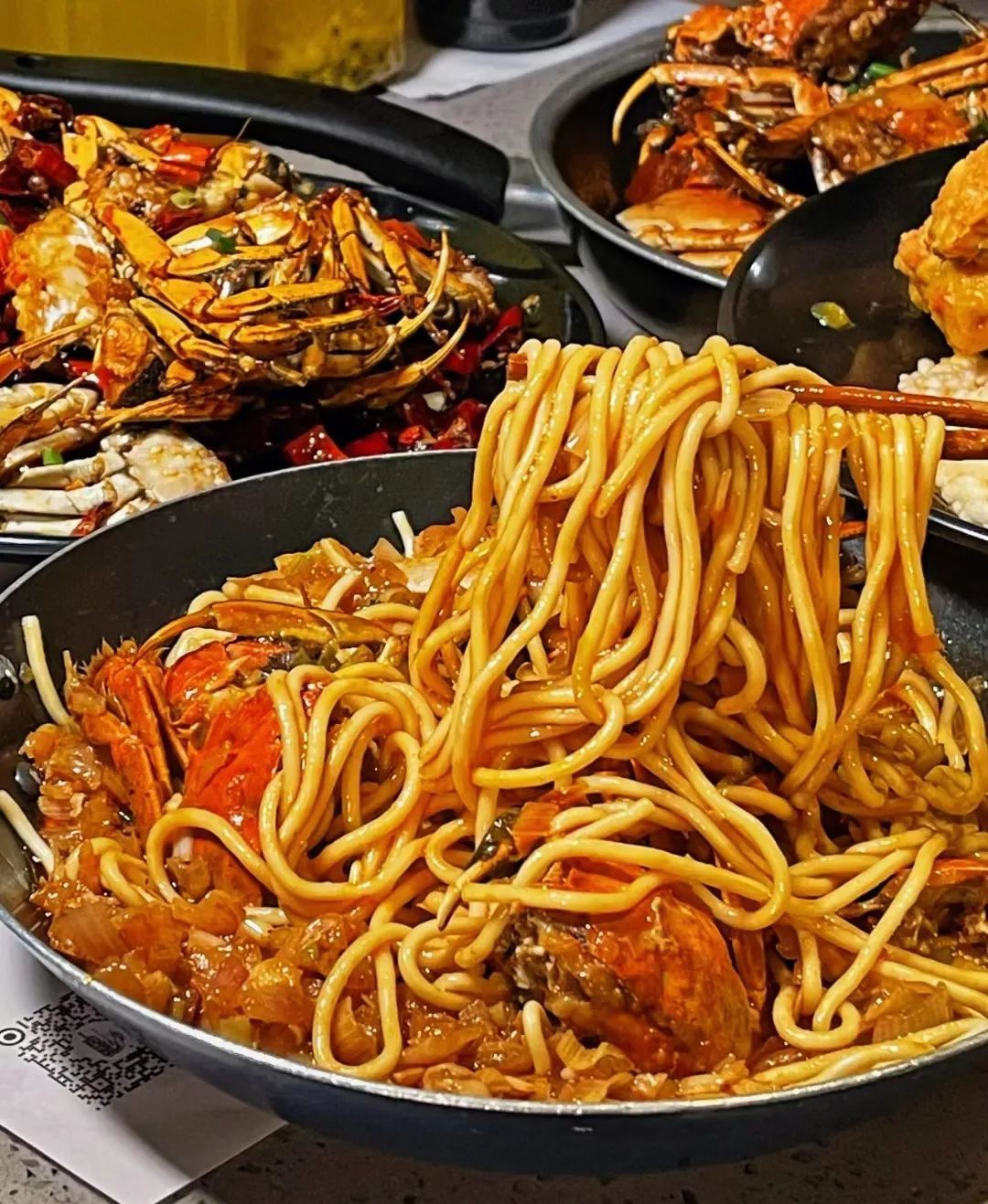 把烧好的蟹脚连汤带汁加入碱水面中,让面条吸饱蟹脚的鲜味,一碗蟹脚面,不仅能吃到香辣的蟹脚,还能“嗦”到筋道入味的蟹汁面,实现“一蟹两吃”。