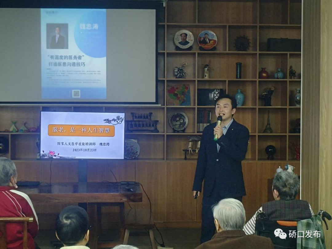 10月23日下午,在武汉福康医养融合医院一楼大厅,为老人做了题为《服老,也是人生智慧》的健康讲座,从“慢”(如何慢出健康,减少心血管等疾病的发病风险)、“放”(老人如何避免病理性怀旧心理)、“安”(如何“换个角度看夕阳”,接纳现状安度晚年)等三个方面,给老人做健康指导及心理疏导。