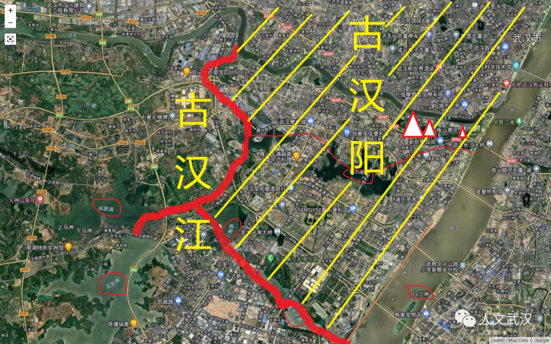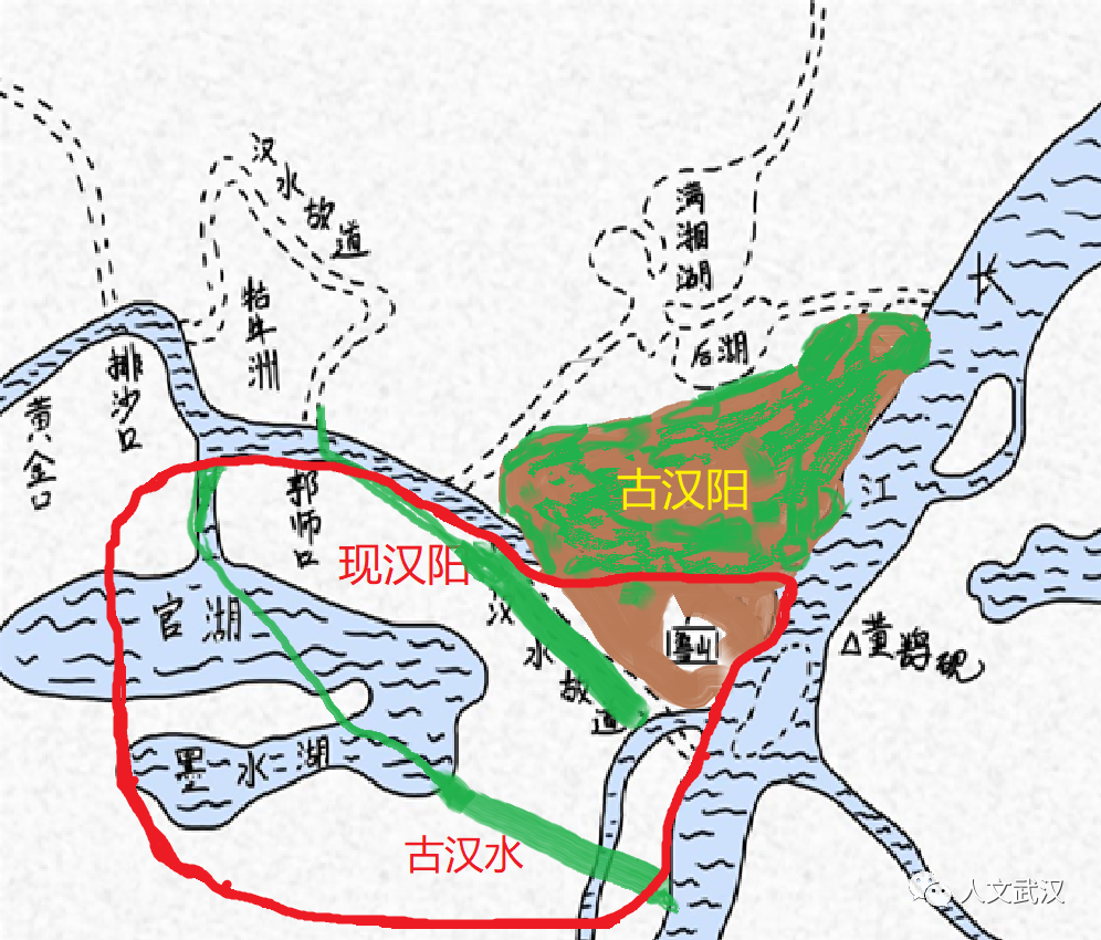 从图中可以很清楚看到,古汉阳在汉水之北,汉阳古城即现在汉阳主城区钟家村与南岸嘴一带,与现在的硚口、江汉、江岸等片区是连在一起的,只不过当时硚口、江汉、江岸等片区还是一片水乡泽国,只是偶尔有一些高台土墩露出水面,成为渔民与候鸟歇脚的地方。