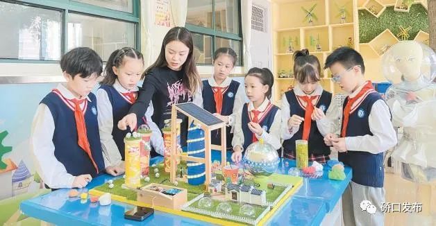 声控灯带、废旧纸盒组合成的丰收农场,一次性筷子加饮料瓶盖制作的摩天轮,鸡蛋托、纸盒、铜丝链接而成的未来学校……10月31日,武汉市硚口区行知小学的羽毛球场上,学生们正在兴致勃勃地参加每月一次的“创意模型展”。
