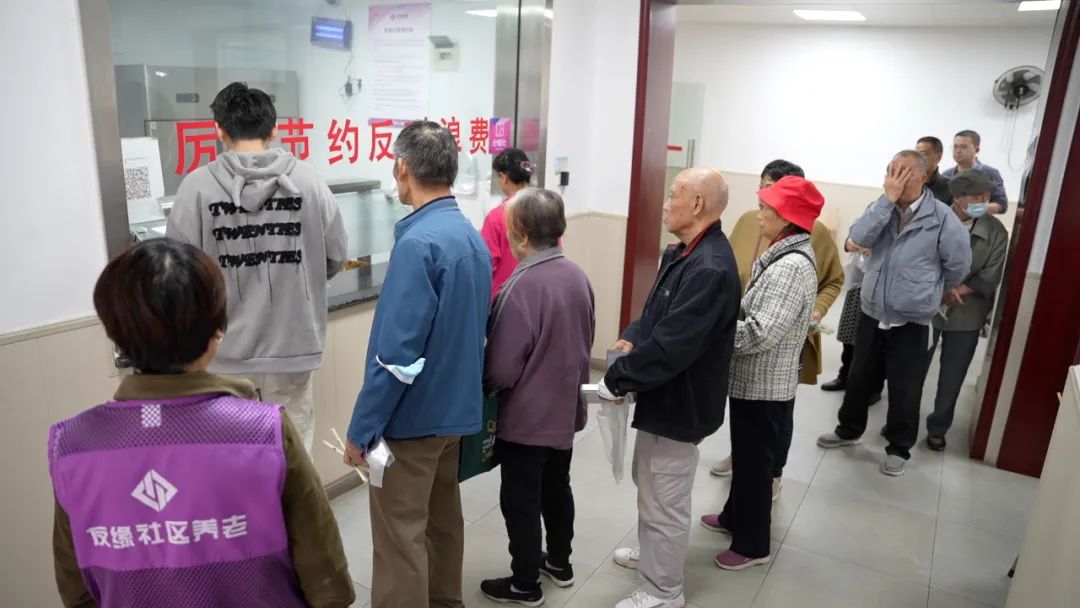 △幸福食堂窗口前,志愿者帮助老人有序排队盛饭