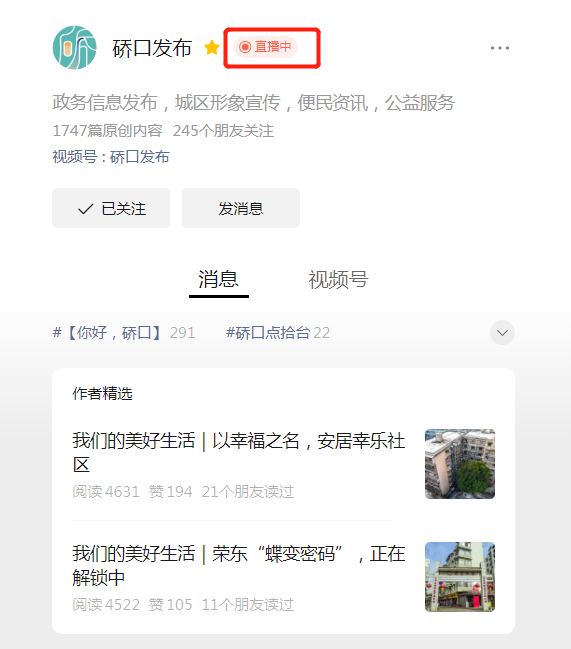 步骤二:进入“硚口发布”微信公众号,点击“直播中”,便可观看。