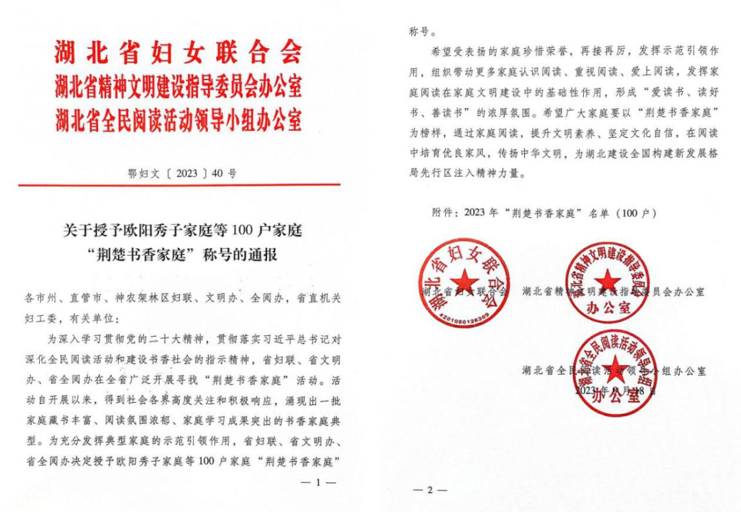 日前,湖北省妇联、省文明办、省全阅办联合评选的2023年“荆楚书香家庭”结果揭晓,硚口区古田街道肖安平家庭荣获“荆楚书香家庭”称号。