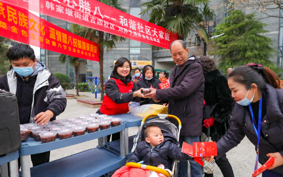 汉正街永茂社区举行腊八节送饼派粥活动。共做东阳饼的活动,既给街坊邻里带来浙江传统美食,也增强了商居凝聚力。今年,越来越多的居民志愿者加入到做饼送饼的行列。永茂社区党委联动汉正街社区服务中心、犇佳康乐养老服务中心,为辖区老人送上“大礼包”:家庭医生义诊走进社区,康养讲座为老人们答疑解惑,理发师现场免费理发。武汉音乐协会韵之友口琴社现场吹奏《共筑中国梦》,社区邀请辖区老人欢聚一堂。