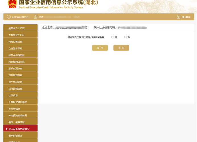 进入进口设备减免税情况页面,填写相关信息,并点击“保存”。