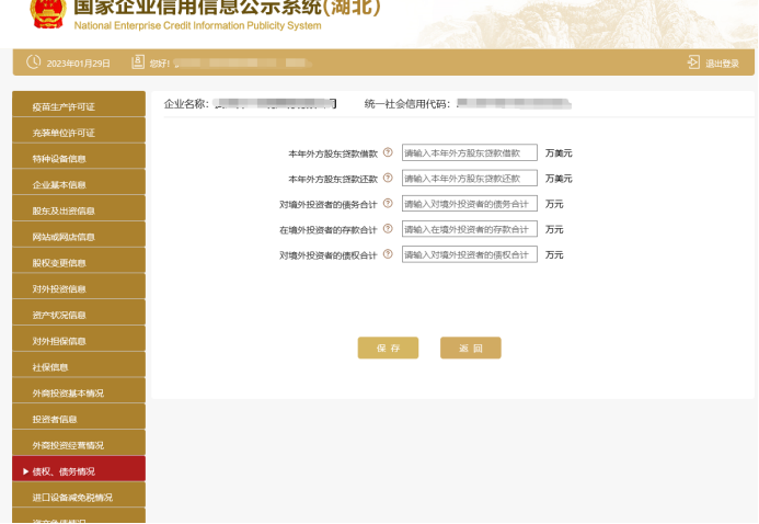 进入债权、债务情况页面,填写相关信息,并点击“保存”。