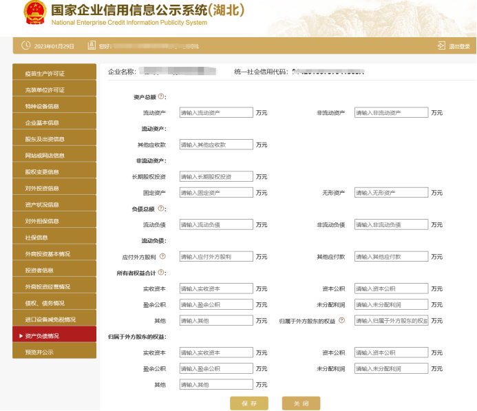 资产状况信息,进入资产状况信息页面,填写信息,企业自行选择是否进行公示,点击"保存”。