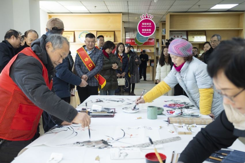 随后,在讲解员的带领下,与会人员实地参观了竹叶海社区“文明HUI客厅”项目及系列“汇聚文明力量”主题展示活动。在悦读慧·红色读书角,社区居民挥毫泼墨,创作出了一幅幅惟妙惟肖、栩栩如生的国画作品。据悉,这里常态化开展“我在文明实践站读好书”活动,采取群众喜闻乐见的阅读形式,让居民们在家门口享受优质阅读体验。