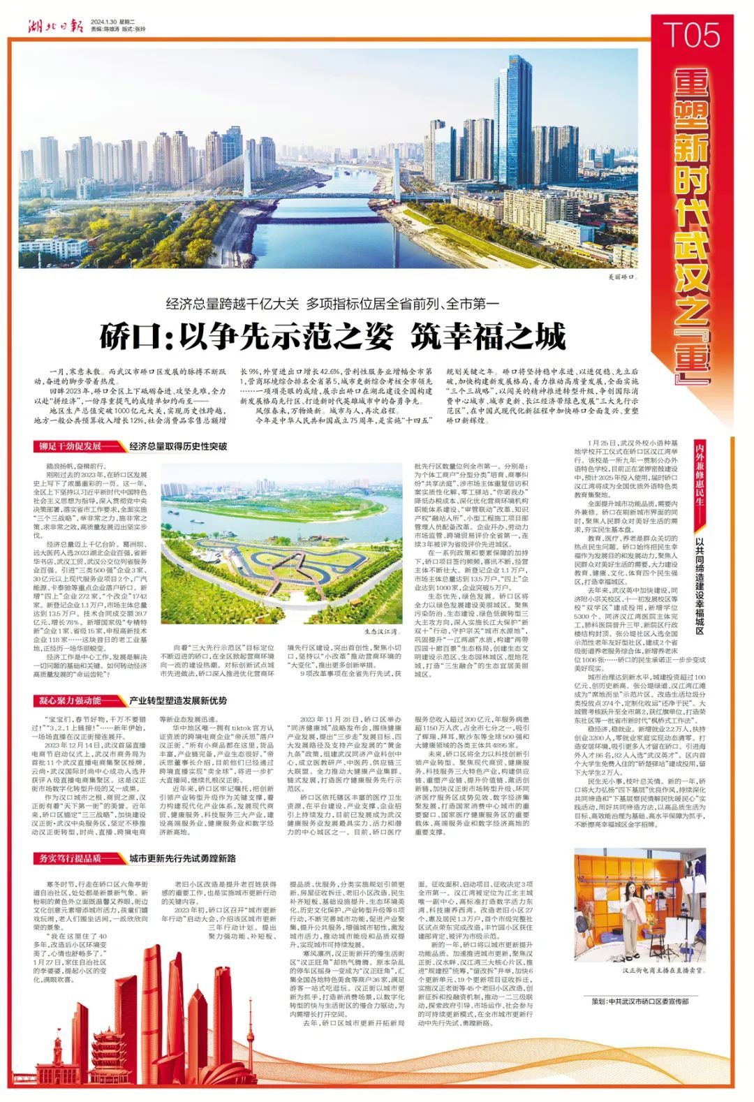 地区生产总值突破1000亿元大关,实现历史性跨越,地方一般公共预算收入增长12%,社会消费品零售总额增长9%,外贸进出口增长42.6%,营利性服务业增幅全市第1,营商环境综合排名全省第5,城市更新综合考核全市领先……一项项亮眼的成绩,展示出硚口在湖北建设全国构建新发展格局先行区、打造新时代英雄城市中的奋勇争先。