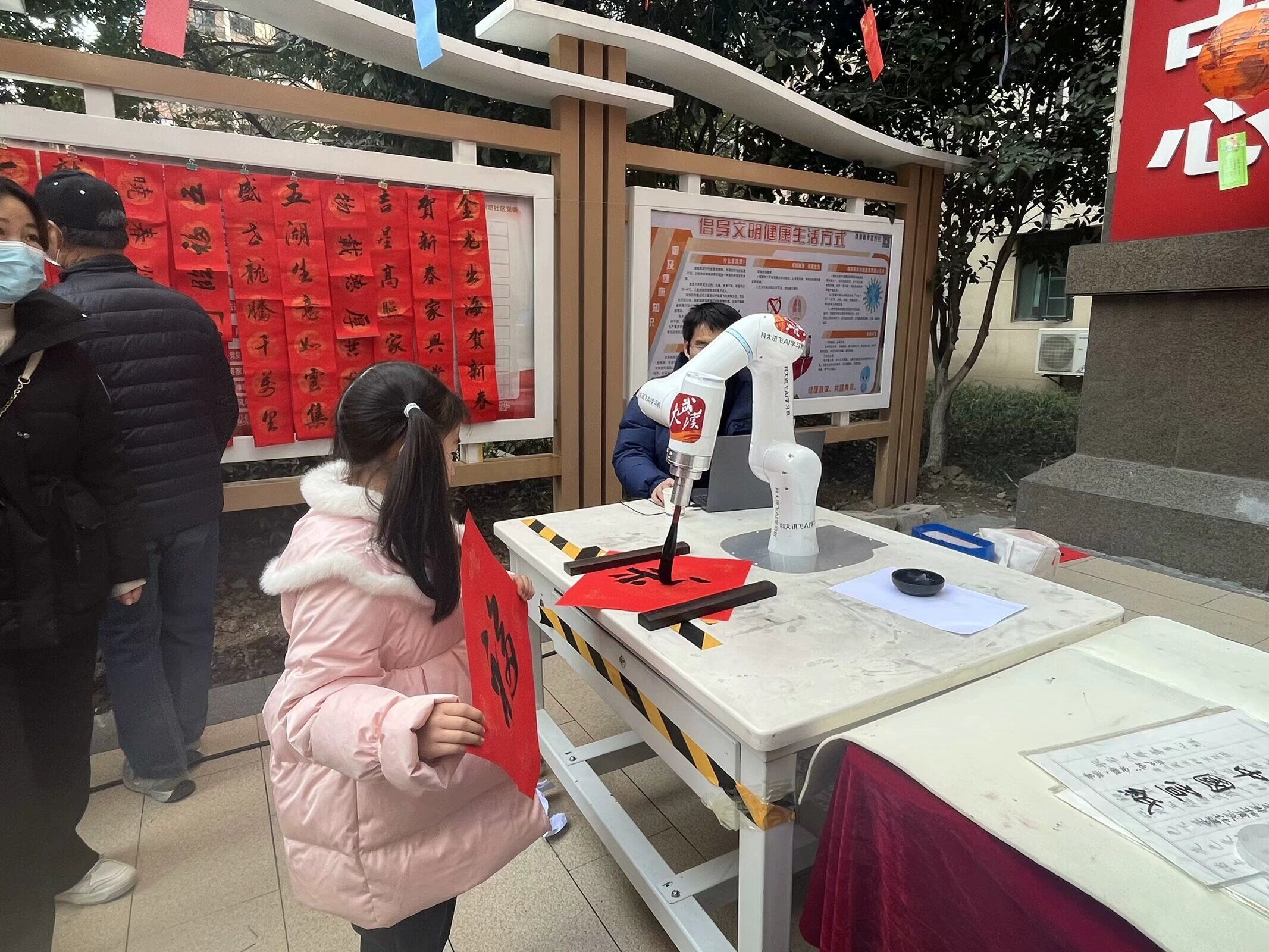 葛洲坝社区的新春庙会活动中,不仅有社区居民壮族姑娘韦林的蒙古族舞蹈、黄邦太、李菊平夫妇的新疆舞《和田故事》和《荷风舞韵》舞蹈队的藏族舞蹈《天边月亮》,还有大武汉书法名家为社区各族居民群众送春“廉”,更有神秘嘉宾AI机器人“小飞”泼墨写下“龙年扬廉兴百业,春日清风福万家”。老党员李浩同志拿着这幅对联爱不释手,告诉街坊朋友们:“我从来没感受过机器人写出来的春联,很新奇,今年我们也尝试新潮流,用机器人写的春联,感受科技的力量共贺新春!”。