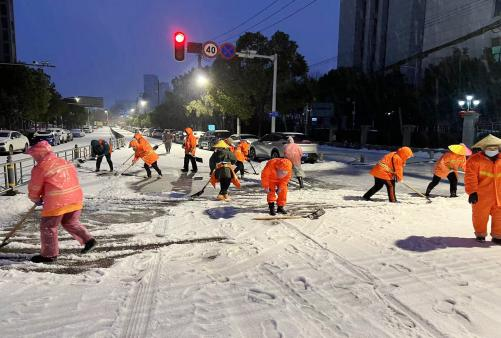 环卫工人彻夜对主次干道播撒融雪剂,大批铲车上路除雪破冰