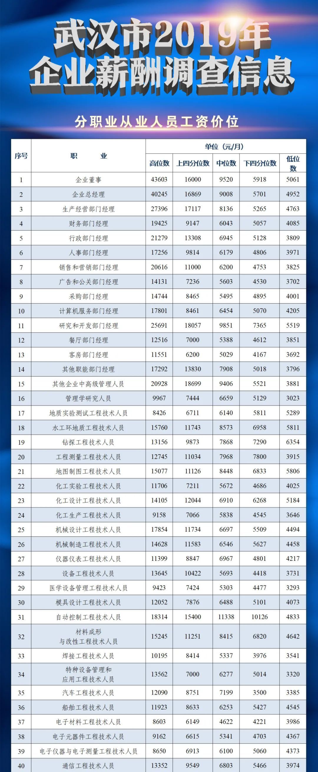日前,武汉市人社局组织对全市1340户企业、17.7万名在岗职工2019年度的薪酬情况进行了调查,经过汇总和整理,形成了武汉市2019年企业薪酬调查信息。