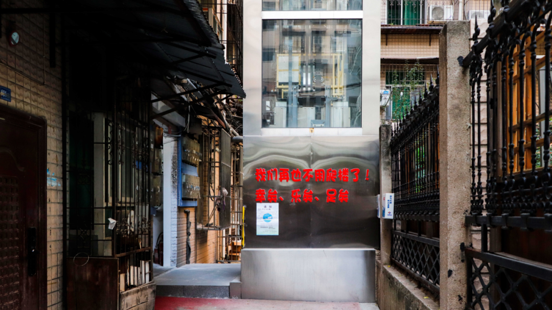 走进幸乐社区华通花园小区,一栋13层高的外立式电梯外侧上的标语格外引人注目:“我们再也不用爬楼了!”