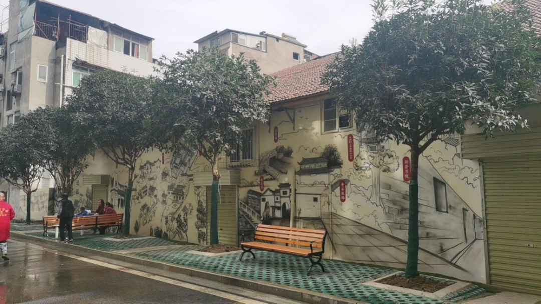“不服周”、“蛮扎实”等充满汉味色彩、彰显武汉精神的词组镶嵌在缤纷色彩的休闲长廊上;鲜艳的党旗与入党誓词组合雕塑则增添了一抹红色印记;“淮盐巷”、“观音”阁一幅幅描绘着汉正街历史性代表性的场景画在墙上徐徐铺展开来......