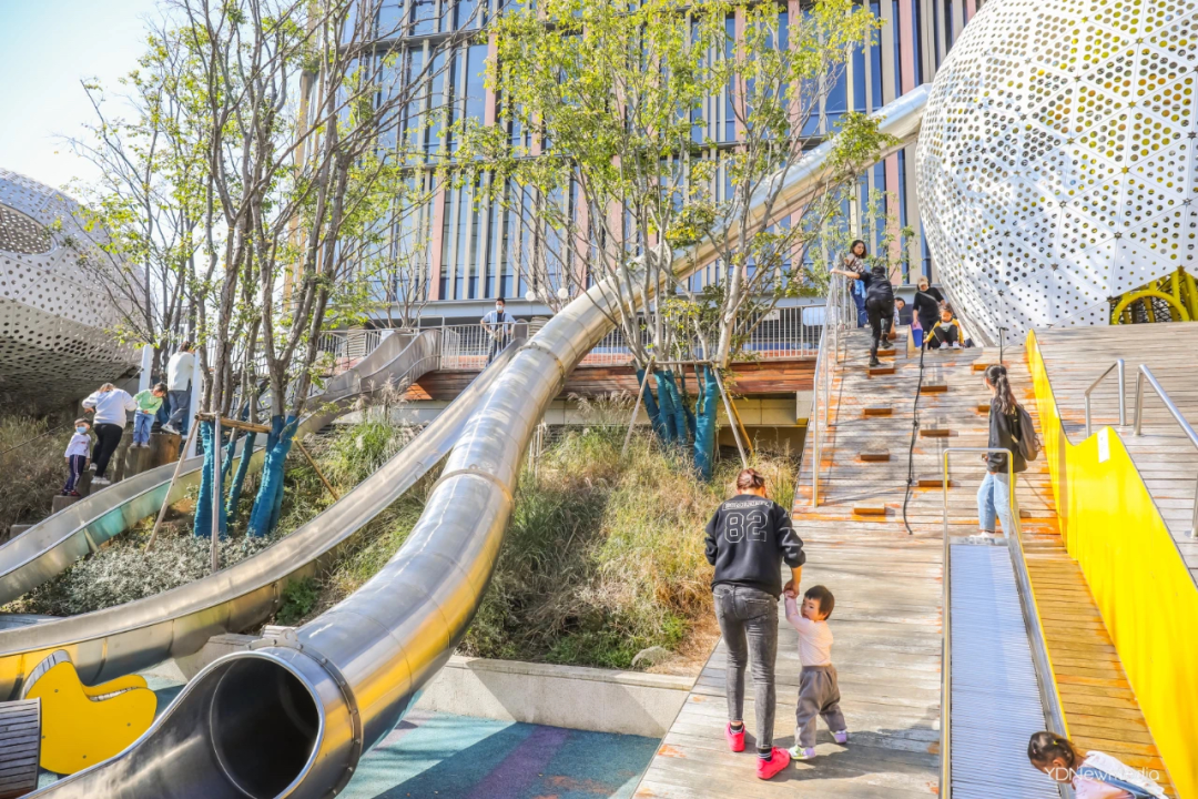 乘坐轻轨1号线,经过“太平洋站”,俯看轻轨脚下不远处,这个“宝藏遛娃公园”一览无余。2021年全面开放的“奇趣蛋壳公园”造型吸睛,长长的烟囱滑梯抢眼,小朋友欢乐的在蹦床里撒欢……不禁让人感叹“这岁月静好的模样真’巴适’。”