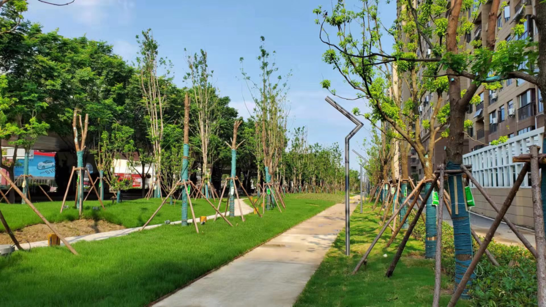 长丰城小区以南的丰华园,合理划分场地功能,将原有长直的视觉流线通过迂回婉转的道路流线设计,提升游园的丰富性与体验感。趣味秋千、特色景观绿廊、艺术坐凳等设施,增加场地趣味性;景观微地形的塑造增加植物空间层次,局部点缀花境,让公园春有花、夏有荫、秋有意、冬有阳。