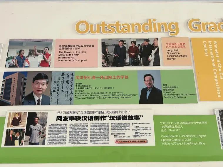 1961年毕业于同济附小(原武汉医学院附小)的原华中科技大学校长、中国工程院院士李培根,1979年毕业于同济附小(原武汉医学院附小)中国科学院院士、免疫学专家董晨,他们的故事同样激励着附小学子。附小校园五楼走廊的院士校友墙记录着他们的故事,吸引着孩子们的目光,鼓舞每一位附小学子向着更高更远的目标努力。附小孩子就是在这样的环境中学习、成长。
