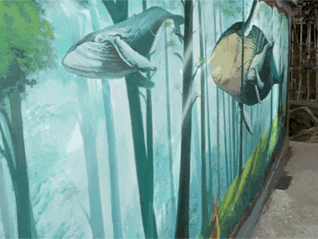 可爱的梅花鹿、清新温润的森林、千年古树上的松鼠、拙朴的树屋......这是宝丰街道公路社区交通小区,全不锈钢材质建筑垃圾屋上的创意绘画。