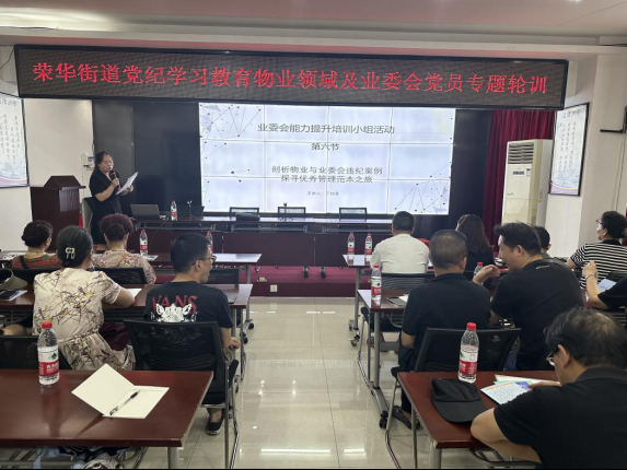 开展党纪学习教育以来,荣华街道党工委高度重视警示教育,持续抓好以案促学、以案说纪,进一步巩固《条例》学习成果。为贯彻落实对重点领域及重要岗位干部分层分类开展专题轮训的有关精神,7月9日,荣华街道党工委结合实际,开展物业领域及业委会党员专题培训,辖区物业领域党组织党员、小区业委会党员30余人参加。