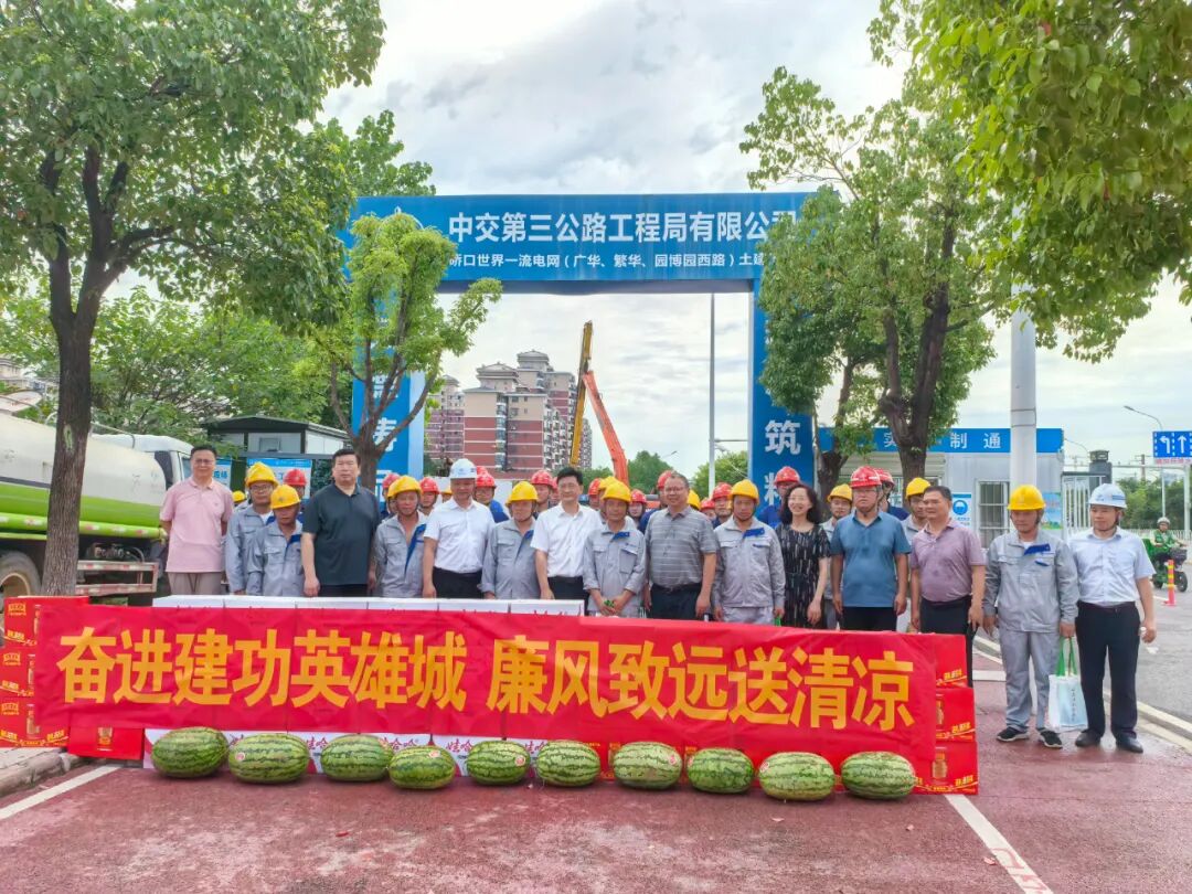 在慰问现场,中交三公局第三工程有限公司负责人介绍了项目进度情况。该项目自今年4月开展“六比六创·三型一流杯”夺标劳动技能竞赛活动以来,一线工人克服梅雨季节天气湿热的不利条件,严密组织、精细施工,保证了项目进度和质量安全。