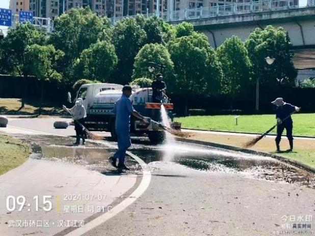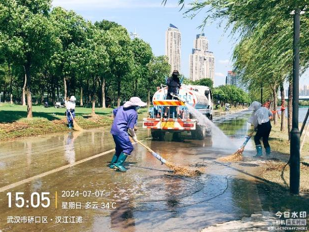 做好退水后清淤消杀及设施安全检修工作。随着水位大幅回落,硚口汉江湾江滩按照“水退一寸、清理一寸”的要求,在江滩现场,环卫、园林工作人员顶着烈日,采取“人机结合”作业模式,对公园广场、临江步道、沿线河滩等区域进行清淤复洁行动,对淤泥污染严重路段进行全方位冲洗,累计清理各类垃圾杂物共计36余吨,出渣16车,清洗面积大约18万平方米。园林工作人员对退水后草坪及时进行修剪,处理折断树枝及倒伏树木36棵,对因退水后冲刷产生的垃圾、枯叶等清理大约6.5吨, 出渣3车。工程人员对全园电力系统进行了安全检测与调试。目前硚口汉江湾江滩主园区清淤及设施检修工作继续进行,主园区将于7月26日再次恢复开放。