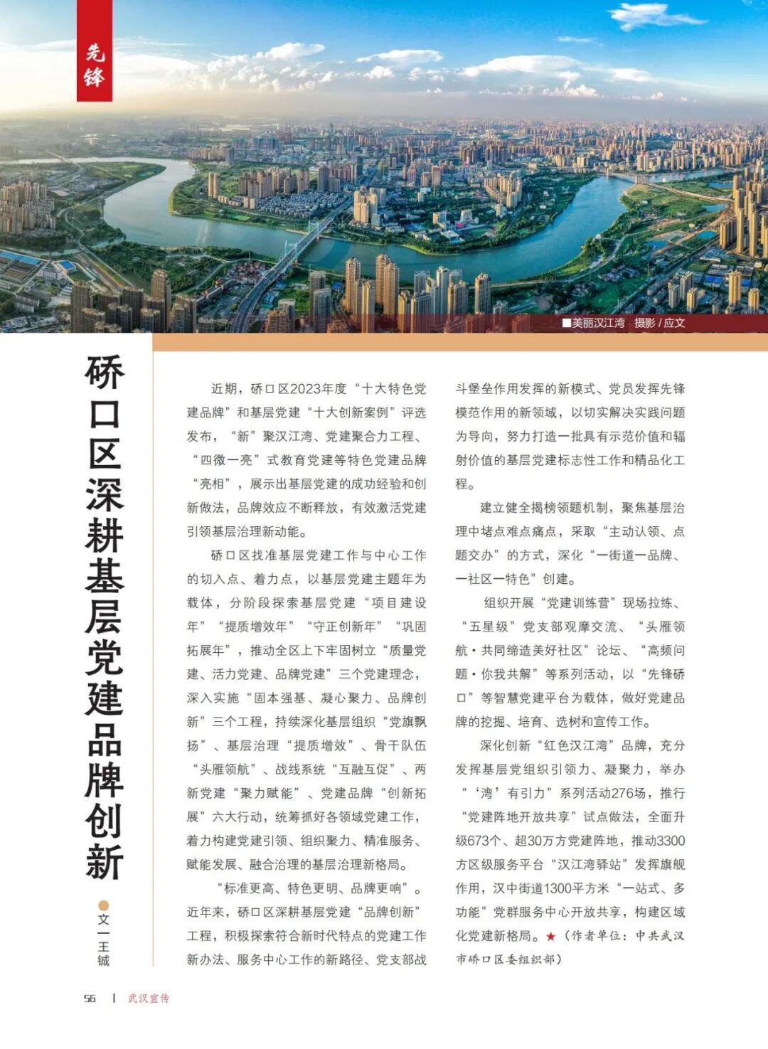 《武汉宣传》报道硚口区创新基层党建品牌的实践做法 2024-07-25 17:20 区委组织部 0 《武汉宣传》 献礼共和国75华诞·特刊 「先锋」 上线! 以“硚口区深耕基层党建品牌创新”为题 报道硚口区基层党建成功经验和创新做法 精彩内容先睹为快~ 查看电子刊 ↓↓↓