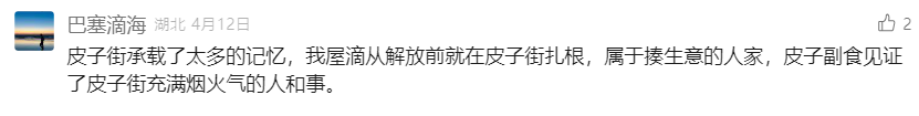 在武汉本地博主@擂拱子的老特 采访皮子街附近居民的视频里,我们看到有人开起理发店、有人开了炒菜馆子、有人卖起了早餐,皮子正街上的皮子市场,原来的厂房林立现在成为一条来了就不想走的武汉美食街,这些无一不是岁月更迭的证据。