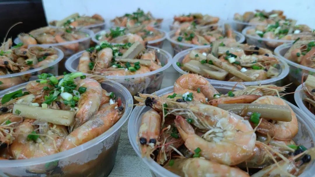 在档口一侧的桌子上,摆放着16份香辣基围虾和打包好的工作餐。幸福食堂负责人朱力介绍,这些是周边年轻人提前一天预订的,两荤一素10元一份,香辣基围虾一份45元。中午11时到12时是食堂最忙的时候,每天要接待200多位居民用餐,其中年轻人占30%。“年轻顾客一般会要求把盒饭带走,我们就提前打包好,避免他们排队。最近天气热,我们还提供2元的送餐服务。”