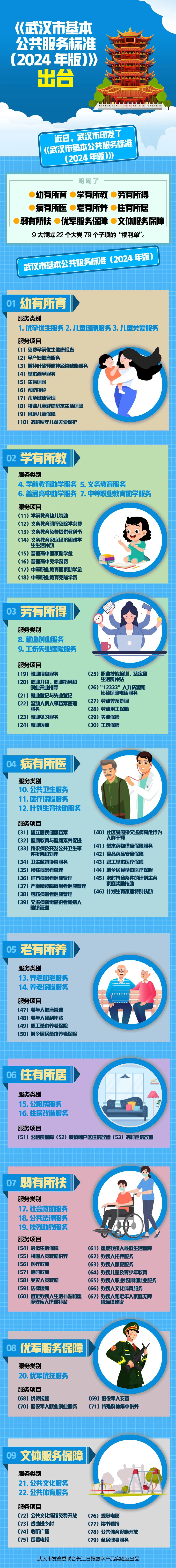 8月6日,长江日报记者获悉,市发展改革委等18部门联合制定《武汉市基本公共服务标准(2024年版)》(以下简称《武汉标准2024》)近日正式印发,围绕幼有所育、学有所教、劳有所得、病有所医、老有所养、住有所居、弱有所扶、优军服务保障、文体服务保障等9大领域,对22个大类、79个具体项目,明确了服务对象、服务内容、服务标准、支出责任和牵头负责单位。