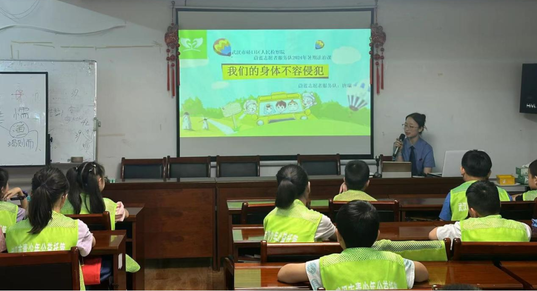 硚口区人民检察院蔚蓝志愿者在暑期班为孩子们带来一堂“我们的身体不容侵犯”法治课。志愿者老师通过视频、歌曲等形式,用通俗易懂的语言以案释法,让孩子们认识自己的身体,了解身体哪些部位是隐私部位、哪些权利不可侵犯。志愿者老师设置游戏互动环节,教孩子们识别潜在危险,面对可能存在的侵犯行为时,勇敢地说“不”。有效提高青少年的法治观念,自我防范和保护意识。