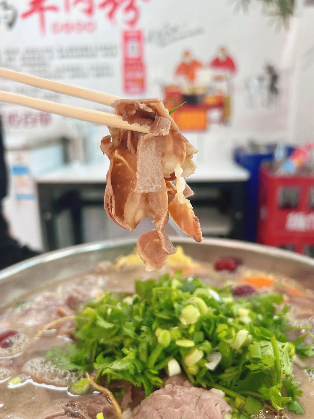 老板将娃娃菜、胡萝卜、红枣、党参等食材连同羊肉一起烹煮,汤端上来呈现暖暖的淡黄色。