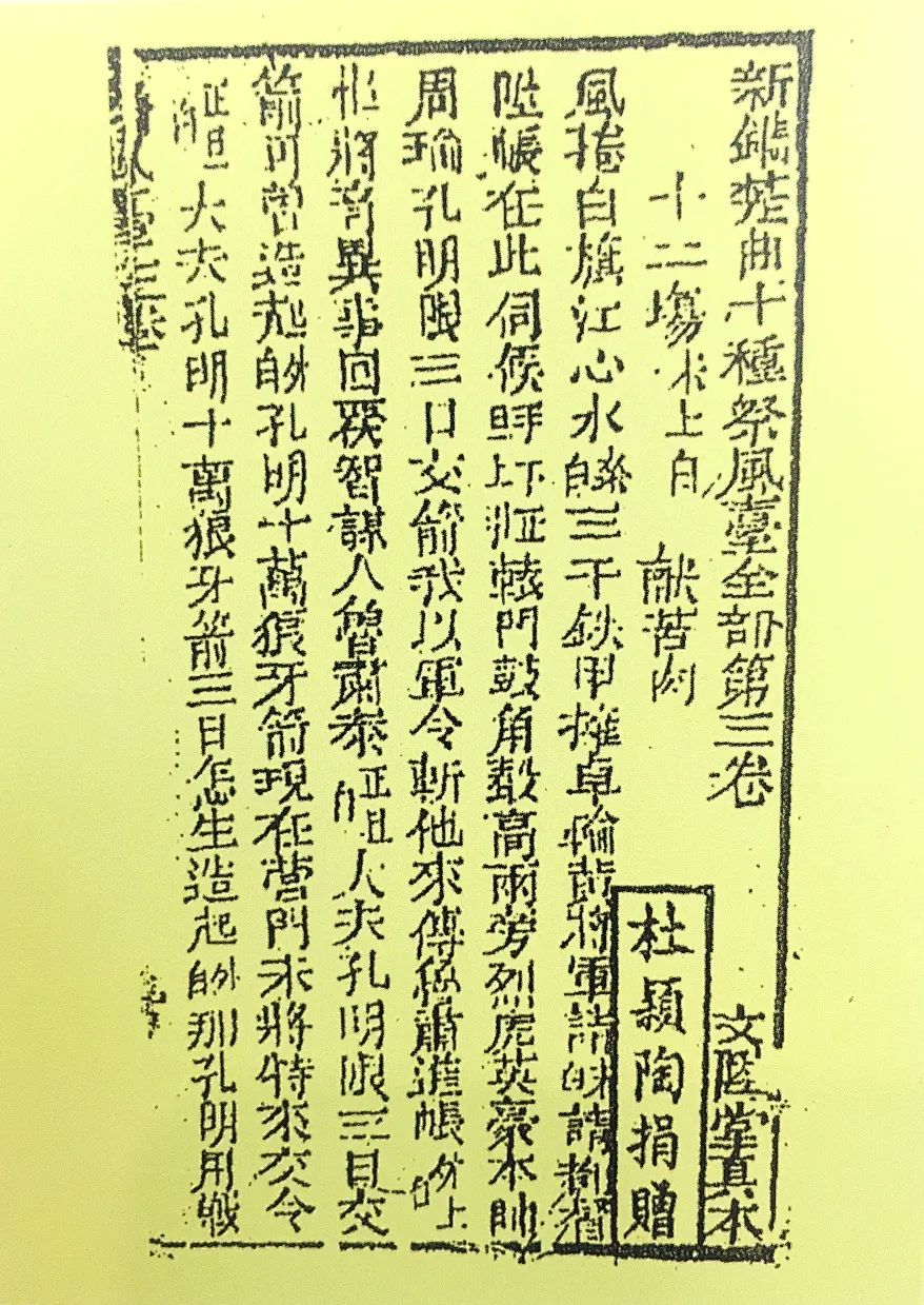 《新镌楚曲十种英雄志全部总纲目》,刻有“杜颖陶捐赠”,“汉口唐氏三元堂珍藏”,在《青石岭》开头“报台”刻有“杜颖陶捐赠”。三元堂、文陞堂刻印的《青石岭》、《英雄志》是由一位名叫杜颖陶的人捐赠给书坊的,或可能是稿本,书坊刻印后为之化身万千。《新镌楚曲十种英雄志上册》、《新镌楚曲十种英雄志二册》,《新镌楚曲十种英雄志三册》、《新镌楚曲十种英雄志四册》刻印“汉口唐氏三元堂珍藏”。楚曲《英雄志》是讲三国历史故事的剧本,有上下册,上册分为报场、诏回、回朝、借兵、跑马、练战、遣将、攻城、息战、自退、惊骇、奏后、进府。下册为观鱼、说吴、答礼、天辩、议征、封帅、接书、起兵、乘舟、败魏、火攻、助战、团圆。这一情节与《三国演义》有区别,其渊源来自元代杂剧的三国戏。