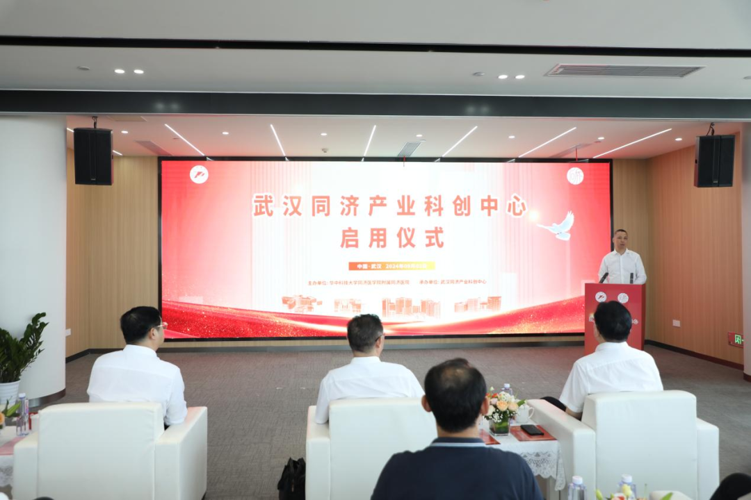 武汉同济产业科创中心是医学成果转化与创新应用试点中心,中心将对外开展药物一致性评价,对内整合利用同济医院现有资源,开展新药研发等项目,未来将重点打造对外技术服务、医药大健康产品孵化、成果转化新药批准文号代持三大平台。会上同济医院党委书记唐洲平发表致辞,他指出同济医院高度重视科技创新与成果转化工作,科创中心启用后,将依托国家重大公共卫生事件医学中心等全国重点实验室、科创平台、高端人才资源,为医院与企业搭建创新转化的桥梁,让科研成果走出实验室,走进生产车间,走进临床,让科研专利变成患者的福利。硚口区人民政府区长苏海峰致辞,他指出自去年11月28日发布同济健康城“三四九”战略以来,硚口区重点围绕搭建创新平台、强化招商引资、推动成果转化、打造产业生态四个方面持续发力。下一步将传承硚口体育冠军拼搏精神,依托硚口医疗资源禀赋,聚焦临床医学科技和药物器械研发等领域,重点打造健康产业发展基金、GSP医贸流通园区等十大最优健康产业生态圈,推动产业链和创新链深度融合发展。湖北省卫生健康委员会二级巡视员江中三致辞,他指出同济产业科创中心的启动是落实党的二十届三中全会,响应国家科技创新驱动发展战略的生动实践,也是贯彻落实省委省政府生命健康产业的具体行动,必将为我省卫生健康事业发展注入新的活力。同济医院院长胡俊波、钟祥市政府、罗田县政府等均围绕健康产业发展、科技成果转化发表致辞。