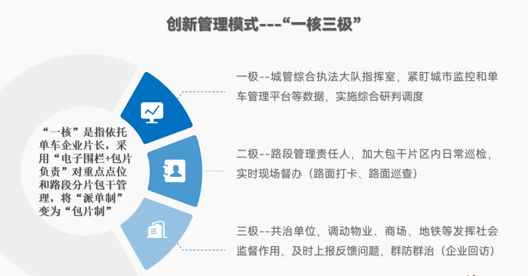建立“越秀共享单车”微信群,打造“一核”——单车企业片长、“三极”——执法大队指挥室、路面巡查执法人员、共治单位等各方力量的协同工作共同体。