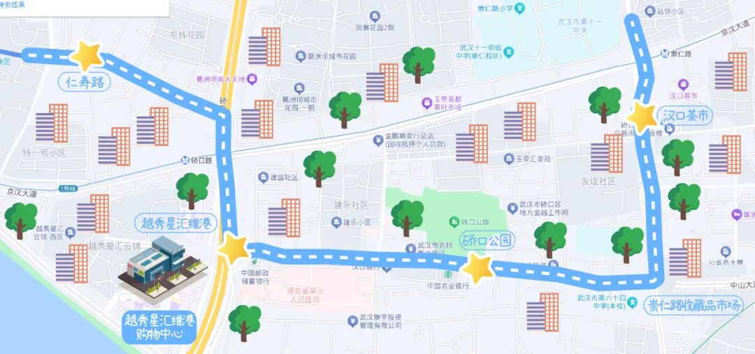 仁寿路-越秀星汇维港购物中心—硚口公园—崇仁路收藏品市场—汉口茶市