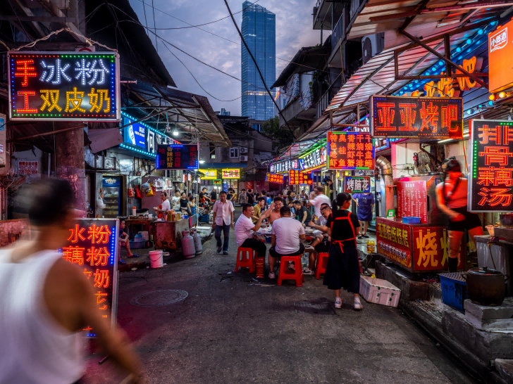 在这里,没有正襟危坐的温文尔雅,没有锦衣玉食的饕餮盛宴,只有一二友朋的靠杯酒,三五知己的把酒言欢,最多的是,排挡上呼朋引伴的夸夸其谈。一张桌子,一个牛杂锅子,一笼汤包,几盘锅贴,就让人胃口大开了。当牛杂香味和着酒劲激起豪爽时,光膀子上阵似乎是一幅另类的风景。硚口长堤街的夜色,在叫卖声、吆喝声、酒令声、锅碗瓢盆声的混合交响中,弹奏出都市夜生活的多彩旋律。