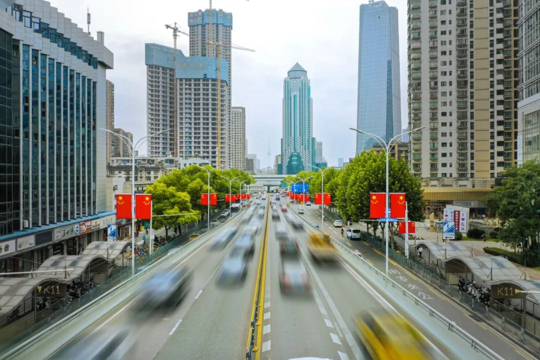 在硚口区主要道路旁升挂国旗。