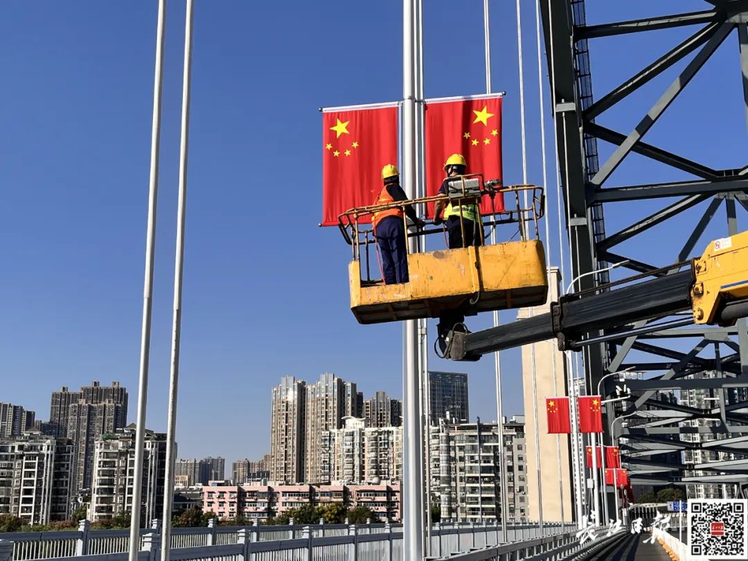 硚口区汉江湾桥面上,工作人员正在升挂国旗
