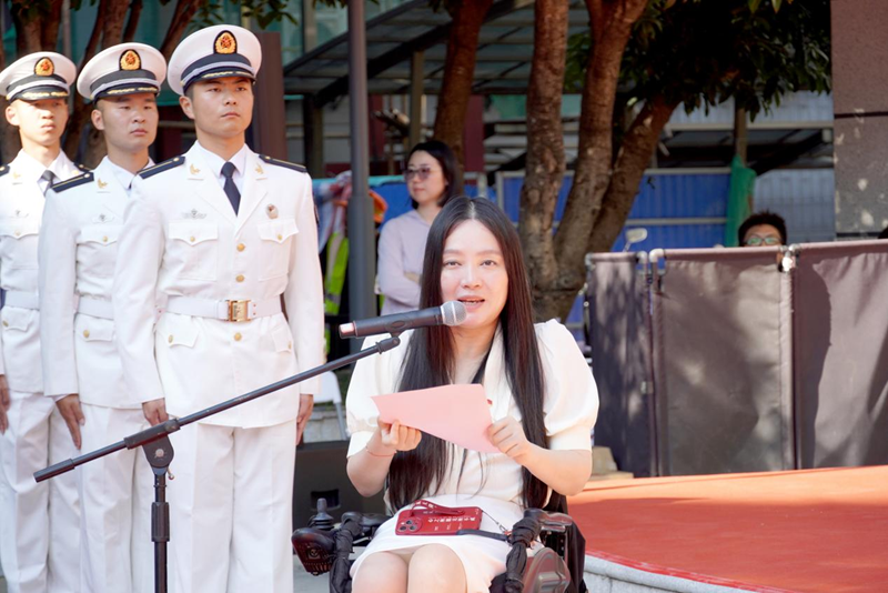 正值国庆前夕,现场举行庄严的升旗仪式,海军工程大学国旗护卫队担任升旗手,全国道德模范董明作国旗下的讲话,她号召广大群众爱国爱党,用实际行动践行文明。