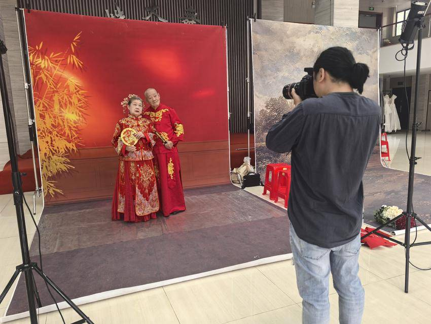 “结婚那会没有条件也没有多余的钱去拍照,忙着生活、养家糊口,一拖再拖就这么耽搁了,后来日子是越来越好,但是年纪大了也不好意思再去拍。”陈阿姨笑着说。今年是她和老伴儿结婚30周年,正好赶上社区请专业摄影师为老人拍照,得到消息后,她便拉着老伴儿赶紧报名参加。“这次活动对于我们来说真的很有纪念意义,也算是了却了我们老夫妻的一个心愿……”正在拍照的老夫妇们露出幸福的笑容。