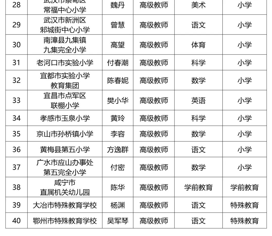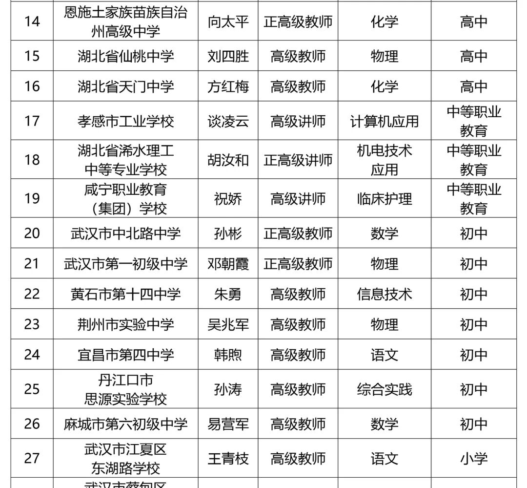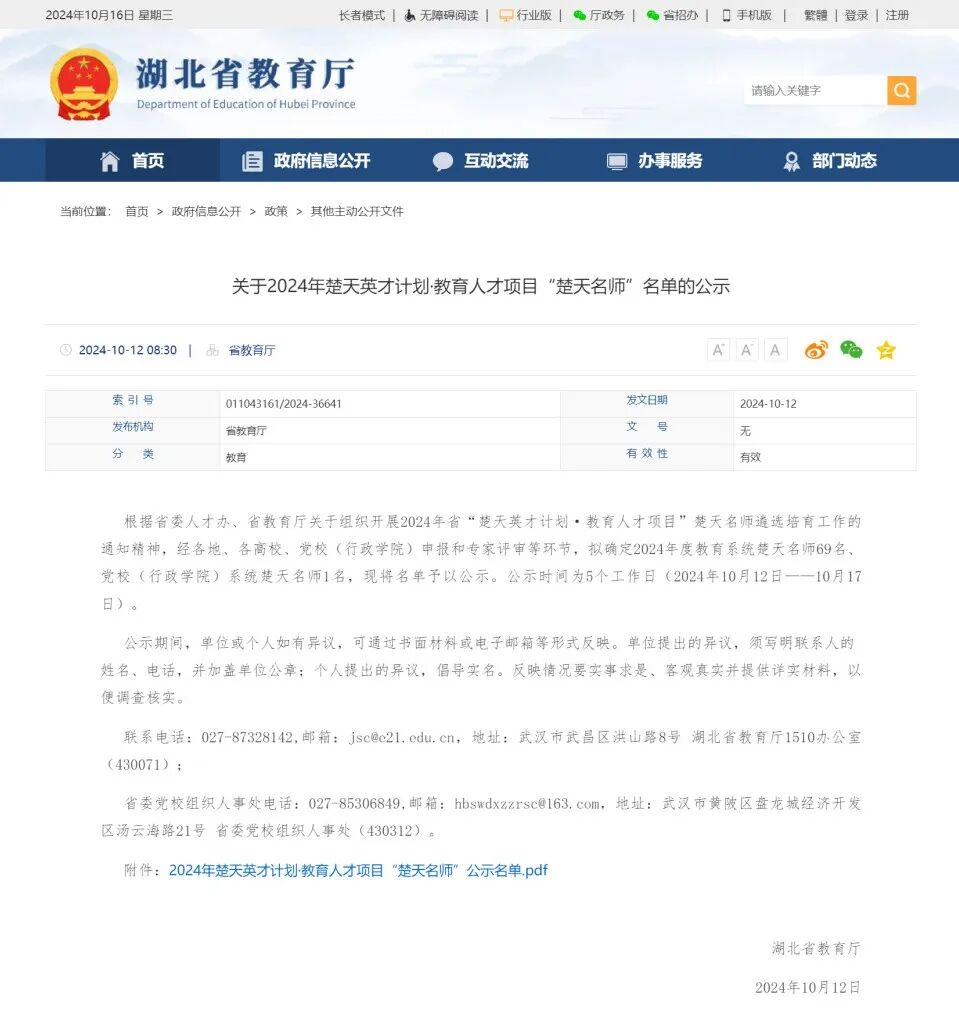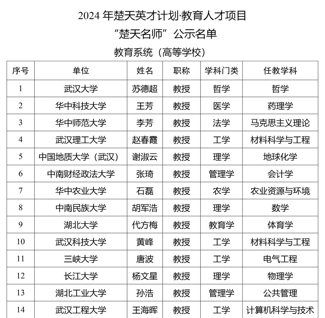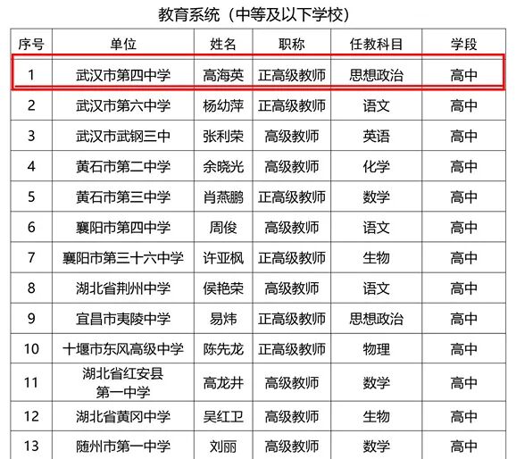 祝贺!硚口楚天名师 2024-10-16 16:28 区教育局 0 在省委人才办、省教育厅组织开展的2024年省“楚天英才计划·教育人才项目”楚天名师遴选培育工作中,我区武汉第四中学高海英老师获评“楚天名师”。
