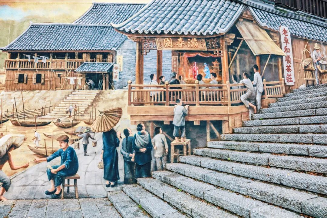 据创作团队之一的武汉的“超级画咖”壁画团队负责人张浩介绍,手绘墙画以清末民国初年汉水码头为切入点,再现老汉口码头的繁忙交易场景,以及汉口居民生活方式的场景。墙画巧妙融入汉口码头工人、老字号小吃、京剧汉剧等武汉非遗文化元素。作品既富有地域特色,又充满艺术魅力。
