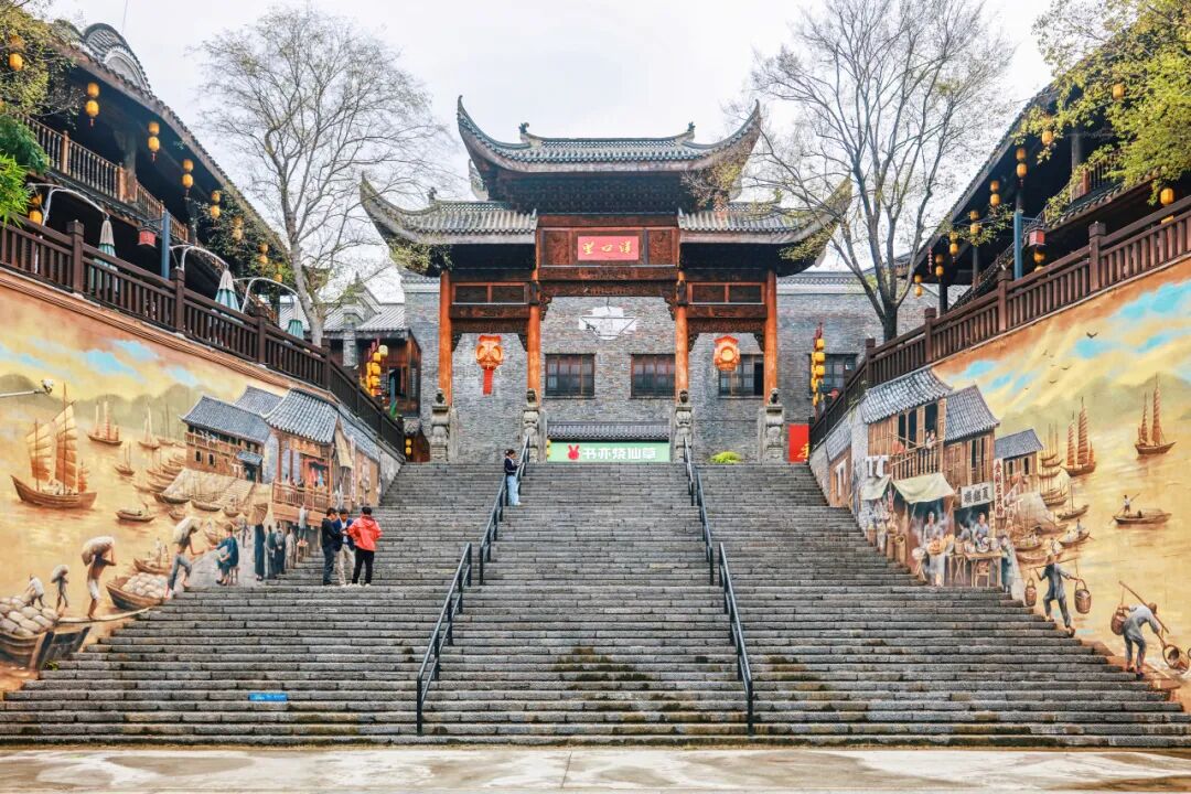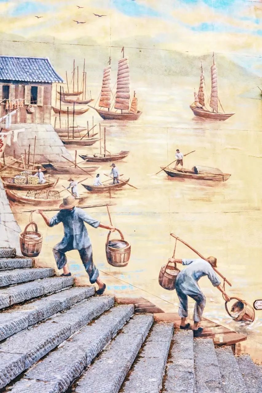 亮相的手绘墙画在汉口里码头牌坊处,面积约400平方米。手绘墙画以汉口码头“起坡上岸”台阶为轴线,分为左右两部分。游客从地铁7号线B2出口拾级而上,充满历史感的汉上风情悠悠然铺陈开来。远处,江水滔滔,城中之山气象雄阔;江上舟楫穿梭,帆影叠叠;近处,岸边商船林立,下河挑水人川流不息;吊脚楼依河而建,高低错落,再现了《汉口竹枝词》中呈现的“十里帆樯依市立,万家灯火彻宵明”场景。特别是手绘墙画表现的码头工人肩扛货包,顿颤地往岸上走去的画面,令人耳畔仿佛荡起“唉呀么喳呢一喂”的码头号子声。
