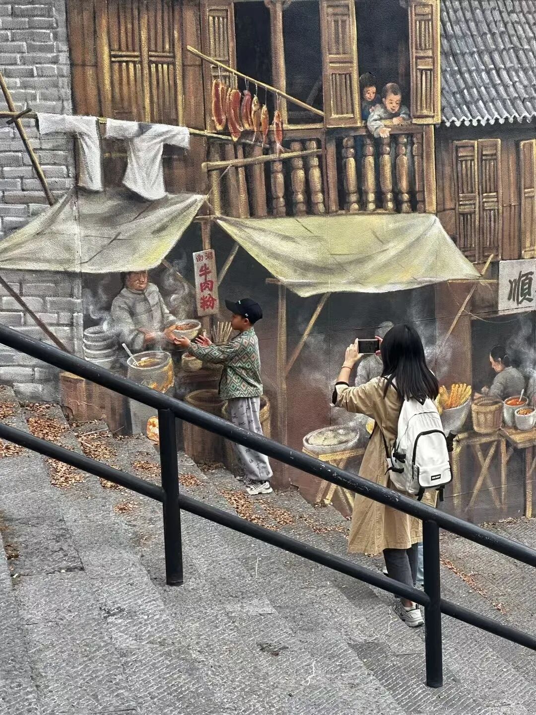该手绘墙画由来自新加坡艺术家叶耀宗和武汉的“超级画咖”壁画团队联手打造。色彩丰富极具立体效果的画面吸引市民驻足观赏,还吸引一些游客前来打卡留念。