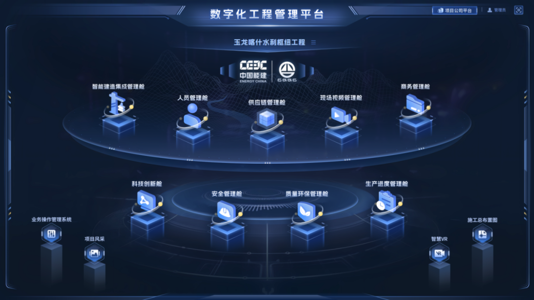 玉龙喀什水利枢纽工程数字化工程管理平台,便是此方案的落地实践。该平台综合通过可视化驾驶舱、业务管理子平台、智能建造数据集成平台、施工全景展示等可视化技术,展现项目管理的全貌,实现了工程项目和智能建造的一体化管理,通过智能化管理方式让人力资源管理成本下降20%,主材采购率降本成效明显。