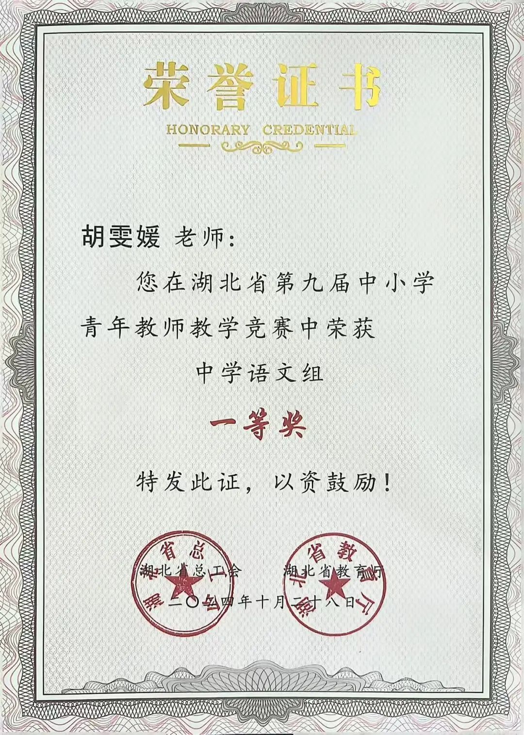 2024年10月28日,湖北省第九届中小学青年教师教学竞赛成绩揭晓。我区十一高胡雯媛老师勇夺中学语文组一等奖第一名,斩获“状元”称号!